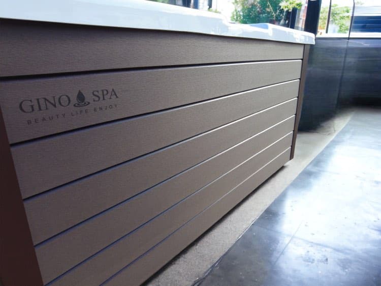oldalburkolat: WPC gondozásmentes szálcsiszolt mintázatú szürke/barna színben, rejtett csavarozásút mm vastag, magas kopásállósággal