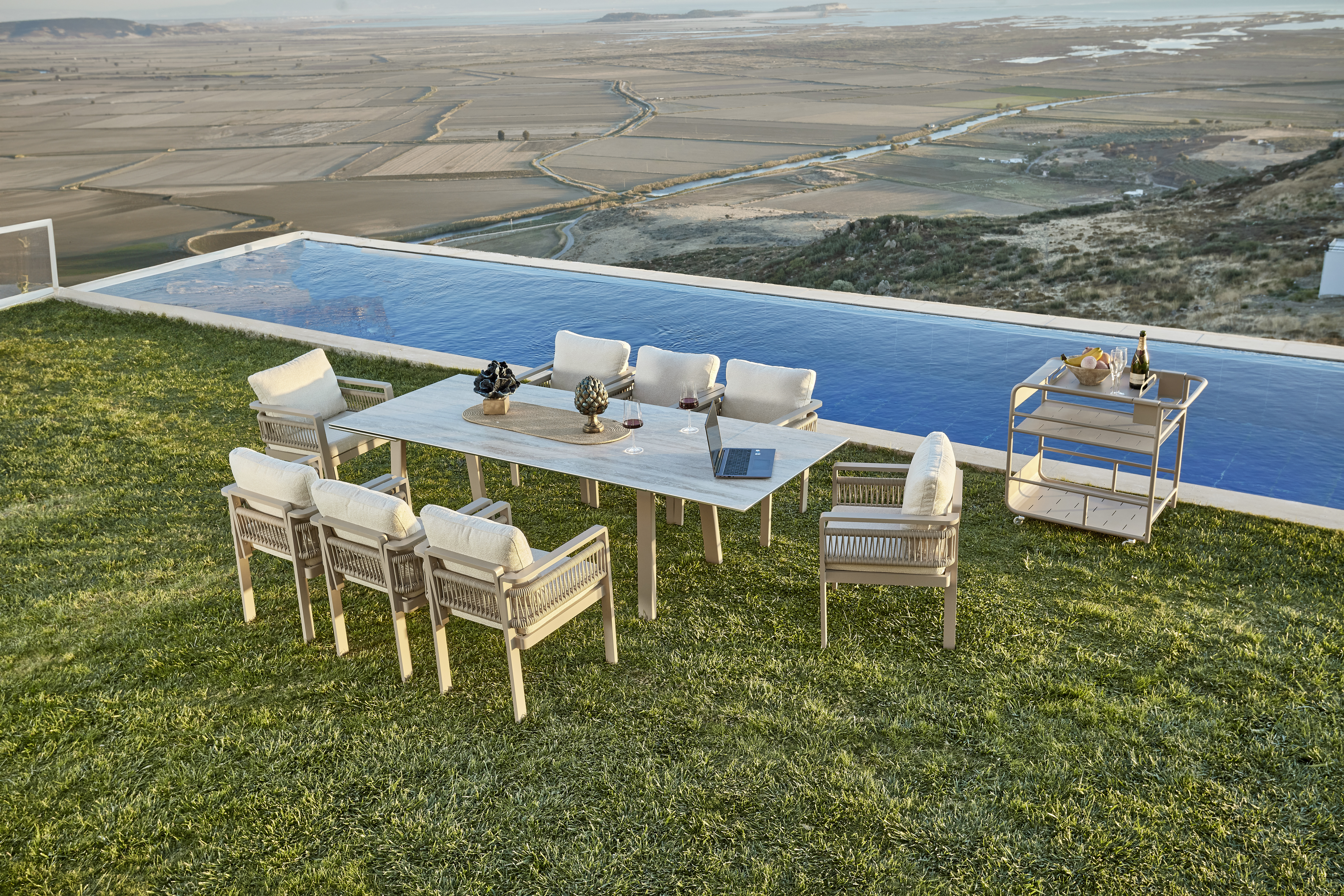 A szett tartalma: Toscana 200×100 Asztal Kerámia Lappa és 8 db Toscana Szék.